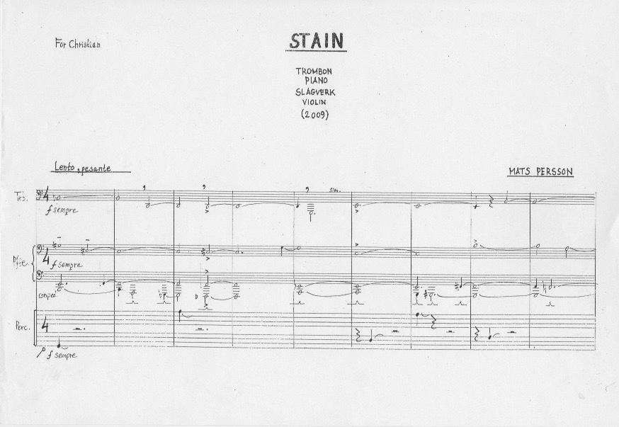 Mats Persson Stain trb, pf, perc, vl (2009) Price 200 SEK Durata 13' Mats Persson Works by Mats Persson SKU ES.MP.002 Genre quartet ensemble Instruments included piano percussion trombone violin